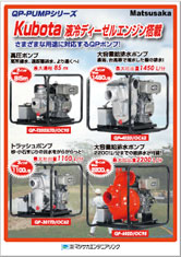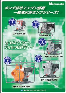 型番モーターポンプ、 ガソリン・ディーゼルエンジン農業潅水ポンプ、 ガソリンエンジン高圧高揚程ポンプ、 動力噴霧機、 ガソリンエンジン大容量排水ポンプ、 ガソリンエンジン汚泥水排水ポンプ、 ディーゼルエンジン海水・塩水移送ポンプ