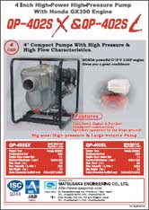 - 6”x 6” QP-602/GX390 with OHV engine adoption makes it possible large flow out in emergency dewatering ・ ・ 20m Maximum Head (m) & 2900 Maximum Flow capacity (L/min)